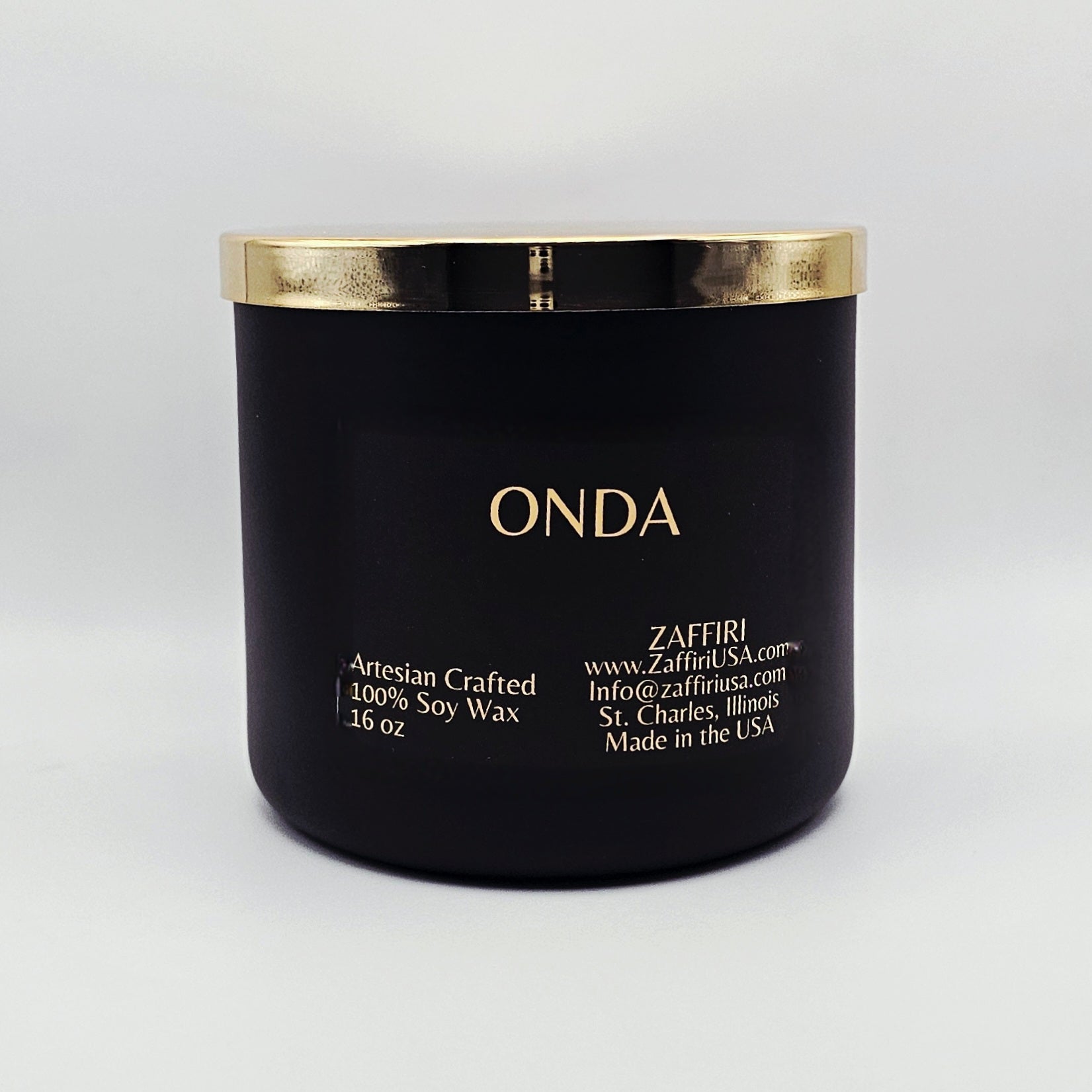 Hand poured into a 16oz black glass jar with striking reflective gold lid. The lids for ZAFFIRI candles act as a surface to place your lit candle when in use.